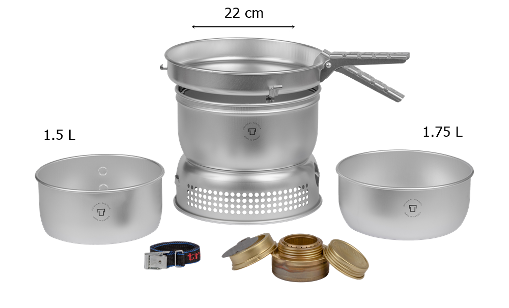 The 27 series set with kettle is offered with the spirit burner only. That’s because this compact stove doesn’t have room for both a kettle and a gas burner when packed up. Of course, you can always add a gas burner or kettle as accessories. There are some exceptions for stove 25 Large where stove+ kettle are not available as a package.