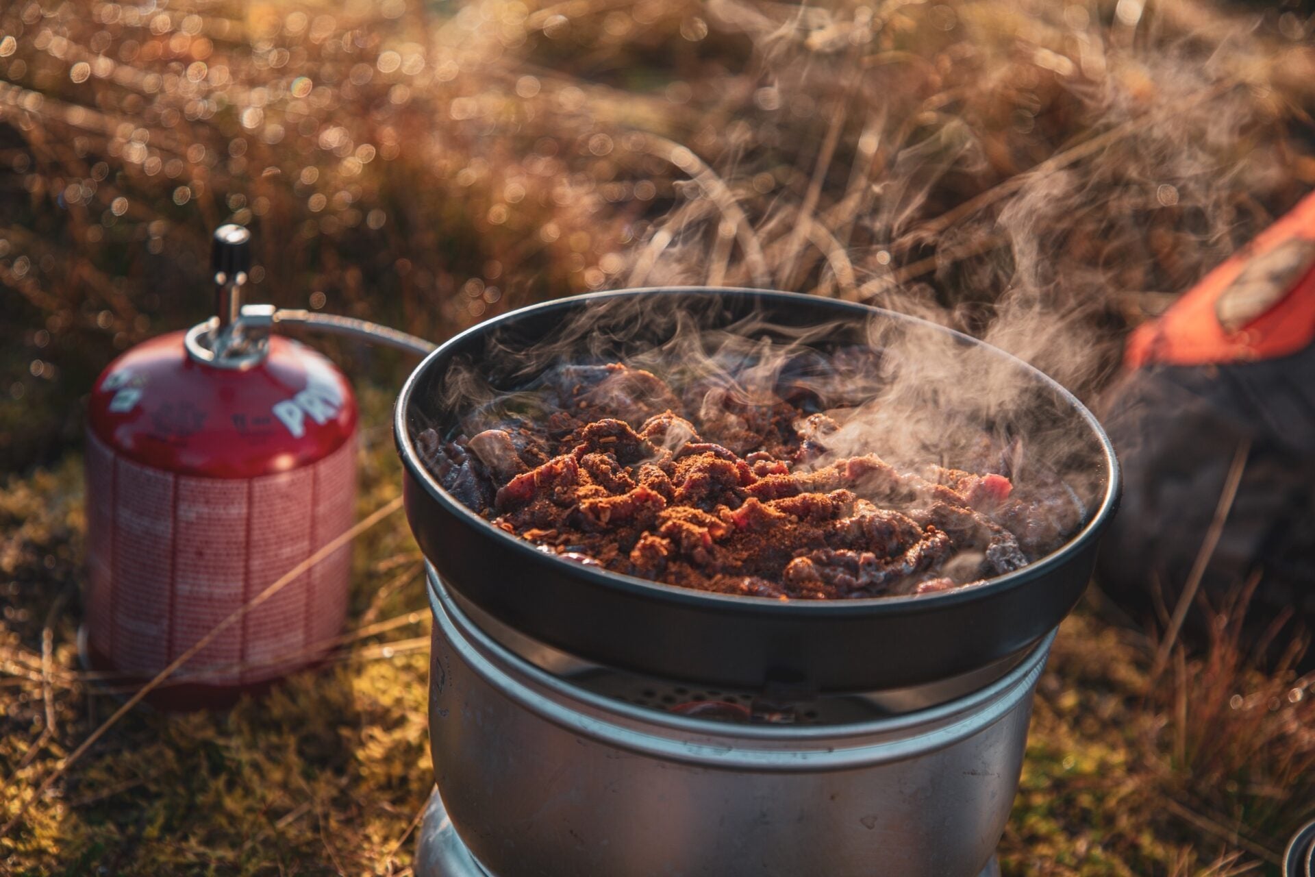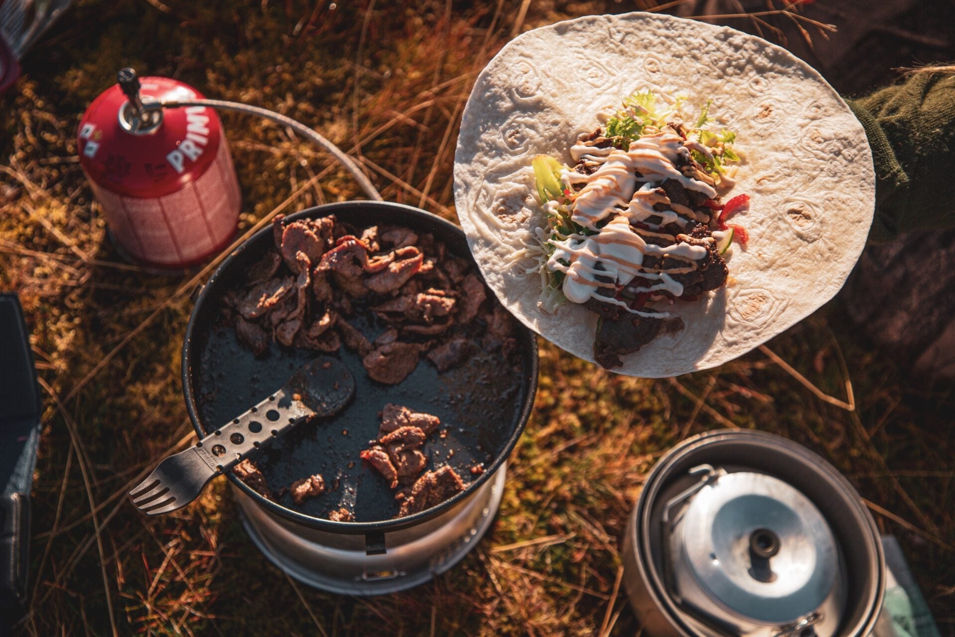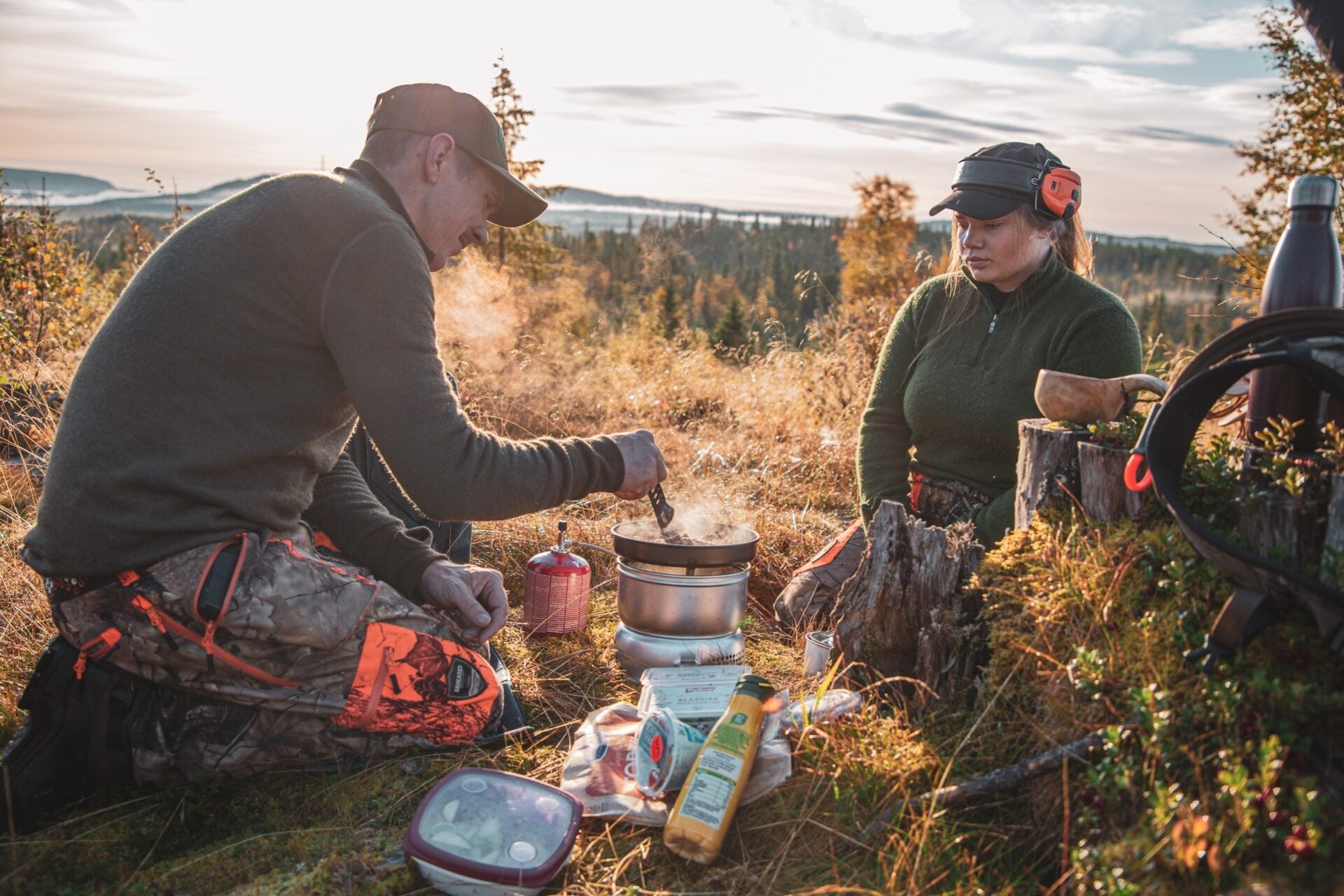 Ante guided us up to his favourite lookout through the forest and over creeks. He has been here many times before, you can tell. The frozen grass made a crackling sound under our boots while we hiked towards the sunlight, that was just starting to reach the treetops. Once we reached the breathtaking viewpoint we were greeted by the stillness, silence and the warming morning sun. Our everyday worries melted away as fast as the morning frost. Ante threw off his backpack, unpacked the Trangia stove and started to prepare breakfast for himself and fellow hunting colleague Olivia. The moose meat simmered and sizzled in the pan and smelled deliciously of the hunter’s mix spice. The meat was served on wheat tortillas with lettuce, onion, tomato, capsicum, cheese and aioli and hot sauce. A more luxurious hunter’s breakfast, topped off with a hot cup of camp coffee.