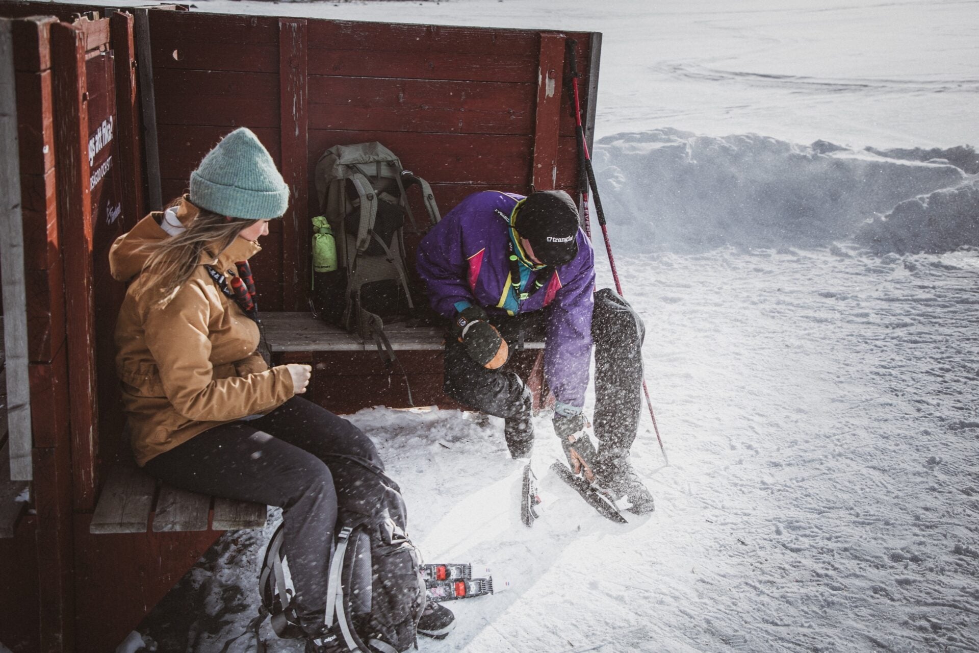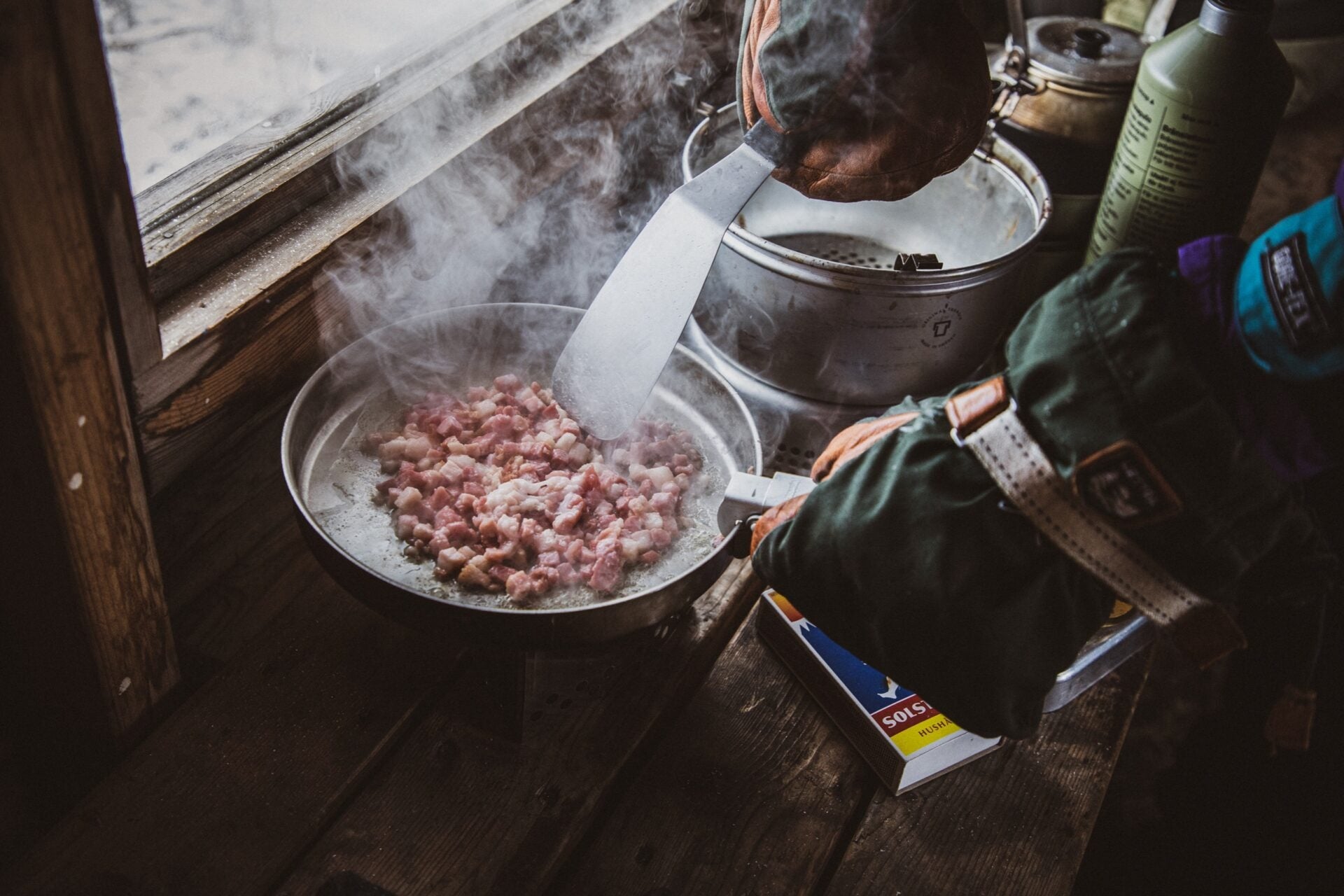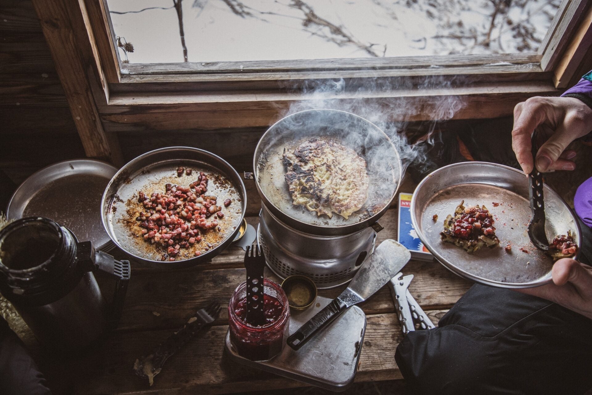 The ice skating session was cold and windy so we took shelter in a small hut. The strong wind helped the snow get in through the cracks in the walls, and forced us to keep out gloves on. Luckily, the batter was already prepared in the thermos, so all we had to do was to light the stoves and start frying. Jonas and Madeleine brought the Triangel stove, to be able to fry and keep the bacon warm at the same time as they were frying the potato pancakes. Jonas had brought the lingonberry jam from home, made on last year’s lingonberries.